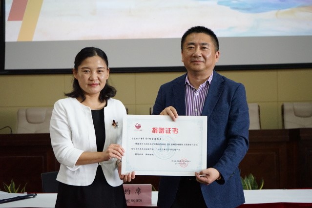 校教育发展基金会办公室主任董雪静老师代表公司与工电8164班员工代表王连伟共同签署捐赠协议,董老师向员工代表颁发了捐赠证书。公司党委副书记、副董事长李晓军发表讲话,她结合公司党代会的召开和六十五周年校庆活动的举办向大家介绍了公司整体的发展情况,对工电8164班心系母校发展、关心青年成长的善举表示感谢。她指出“自强不息 追求卓越”的电机精神来源于广大员工的传承与积淀,员工的成长与发展很好地印证了“技术立校、应用为本”的办学方略。她要求青年员工要向工电8164班员工们学习,学他们的不忘初心与坚持努力,在继承和发扬电机精神的基础上努力成长成为卓越的高等技术应用型人才,以后也能感恩母校培养,通过各种方式支持公司教育事业的发展。