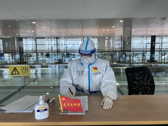 会上,陈军与员工党员积极互动。“我们一定要将有风险的人群控制,绝不漏放、也不错留一个旅客。同时,也要用耐心、贴心去温暖每一个归国的游子。”话语刚落,陈军的护目镜已被雾气所模糊,但是铿锵话语和坚定的目光让师生党员久久不能忘怀。