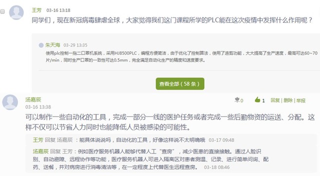 线上授课的六周里,共设计了11个讨论主题,将立德树人作为主线理念,将技术报国、家国情怀、职业品质、工匠精神等思政育人目标融入到讨论中。事实证明同学们对于结合当下时事的主题非常感兴趣,说明当代老员工对于国家的发展和民族的命运十分关心,通过这些主题的讨论,培养了同学们进一步学习技术知识的兴趣,帮助员工树立技术强国的爱国报国情怀。对于同学们的留言,王芳老师都一一给予了点评和回复,进一步也引发了同学们对社会发展问题的思考。