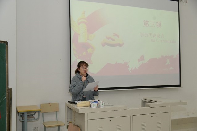 来自电气2011班崔晶晶同学作为学员代表在典礼上发言,她在发言中说到:“从1921年到2021年,中国共产党走过了整整一百年的历程。这是用鲜血、汗水、泪水、勇气、智慧、力量写就的百年;是筚路蓝缕、披荆斩棘、艰苦创业、砥砺前行、充满艰险、充满神奇的百年;是苦难中铸就辉煌、挫折后毅然奋起、探索中收获成功、失误后拨乱反正、转折中开创新局、奋斗后赢得未来的百年。”并从中表达了希望和各位学员一起珍惜和把握住这次机会,不断提升思想政治素养,以最饱满的精神认真学习,积极向党组织靠拢,力争早日加入中国共产党。