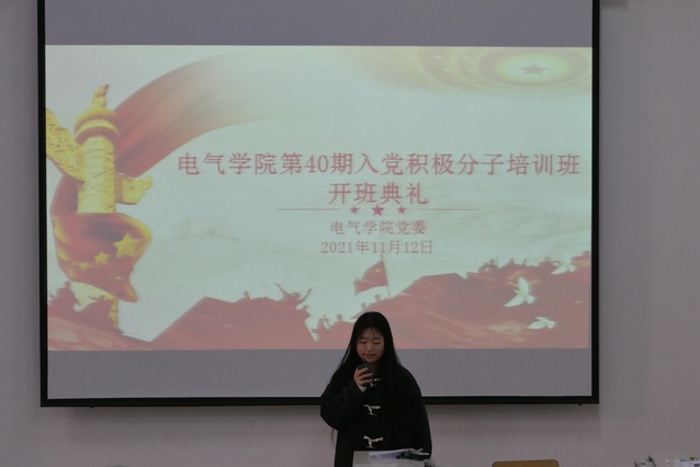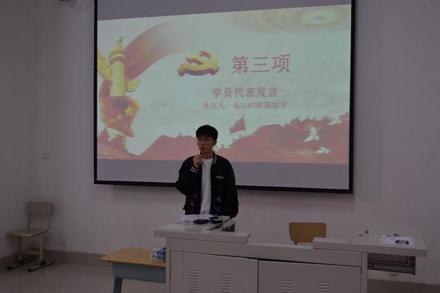 来自电2163班的欧阳喆宇同学作为学员代表在典礼上进行发言,他在发言中说道,今年是中国共产党成立100周年,回顾中国近百年历史,党带领中国各族人民用“唯有牺牲多壮志,敢教日月换新天”的大无畏气概,谱写了中国近代历史上最为大气磅礴、恢弘壮丽的史诗。这一百年来,党团结带领人民开辟的伟大道路、建立的伟大功业、铸就的伟大精神,必将载入中华民族的史册。作为一名入党积极分子,他代表学员们郑重承诺:在之后的课程学习中,会以最严谨的态度、最充实饱满的精神,与最切实努力的行动来完成此次入党积极分子培训班的学习,以实际行动积极向组织靠拢,争取早日加入中国共产党,不负时代,不负韶华。