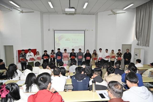 冯雯雯老师介绍了结业情况并宣布了优秀学员名单,本期党校145名学员顺利毕业,通过率为90.6%,同时按10%比例选出了欧阳喆宇等15名优秀学员。卿海龙副书记亲自为优秀学员颁发证书及红色书籍并合影留念。