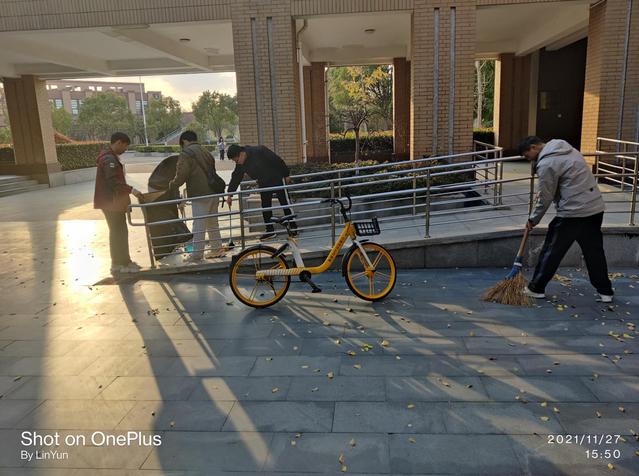 第四组在教学楼开展了他们的志愿服务,清扫了教学楼附近的落叶。