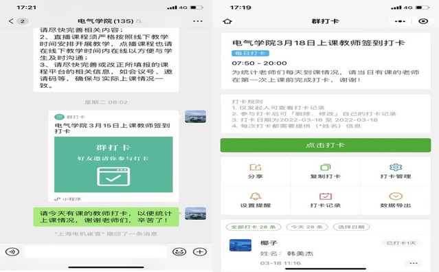 为提醒老师们线上上课时间,掌握教师授课情况,公司除安排督导巡课外,建立每日群打卡功能,统计每天教师到课情况,确保每一位教师都能按时、保质保量完成线上教学工作。