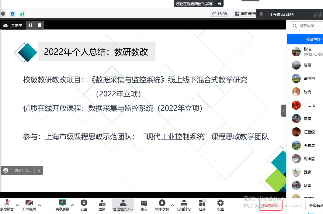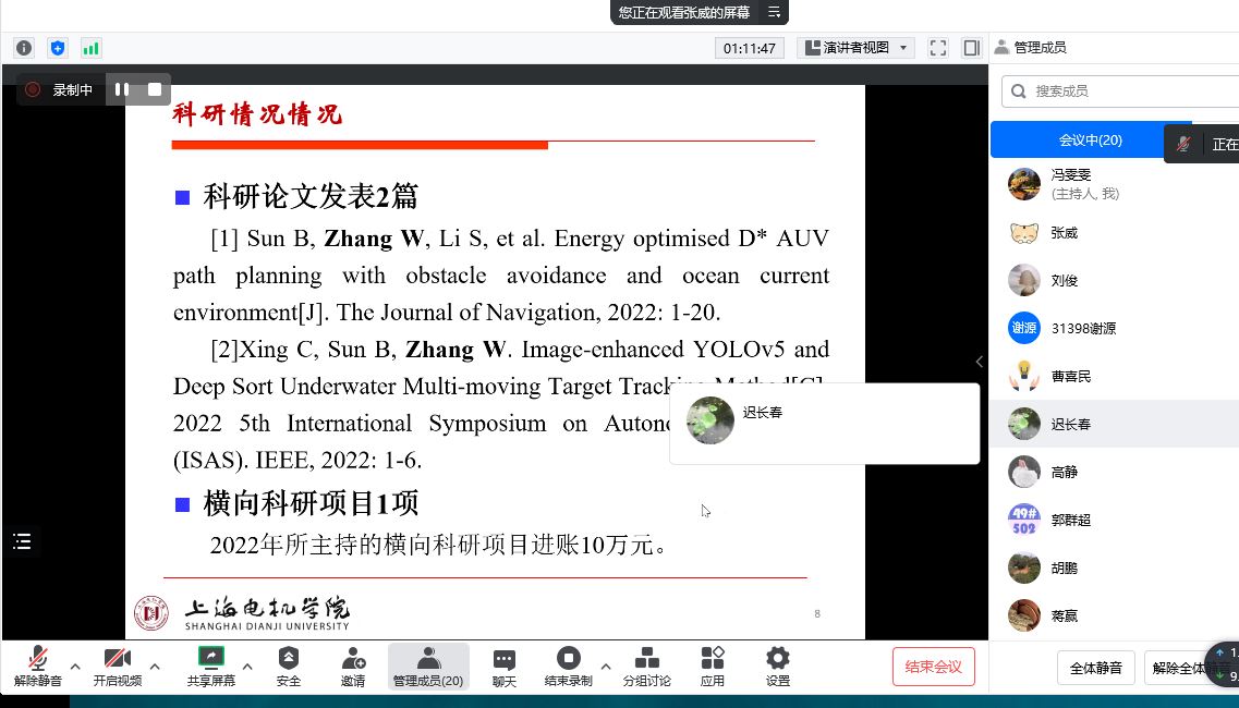 “本年度我承担的《电力系统暂态分析》获校级线上线下混合式一流课程建设项目,发表科研论文两篇,主持横向科研项目1项,科创项目立项1项,指导研究生参加2022年“中国光谷·华为杯” 第十九届中国研究生数学建模竞赛,获全国三等奖。明年我将进一步聚焦我的研究方向,积极申报科研项目,加快我的科研步伐,为提升人才培养质量积蓄更多的动力源泉。”远在加拿大访学的电气系博士教师张威在年度述职交流会上客观地总结自己本年度成绩和展望2023年计划。
