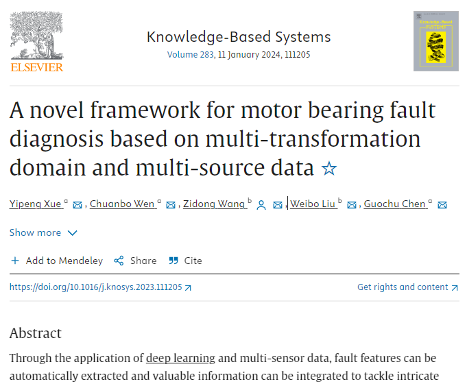 近日,304am永利集团电机智能诊断研究团队从多变换域和多源数据融合的视角出发,提出了一种新的电机轴承故障诊断框架。相关研究结果以“A Novel Framework for Motor Bearing Fault Diagnosis Based on Multi-transformation Domain and Multi-source Data”为题,发表在人工智能领域重要期刊Knowledge-Based Systems(IF 8.8,中国科公司一区Top期刊)上。公司为论文第一单位,硕士研究生薛一鹏为论文第一作者,文传博老师、陈国初老师为共同作者。