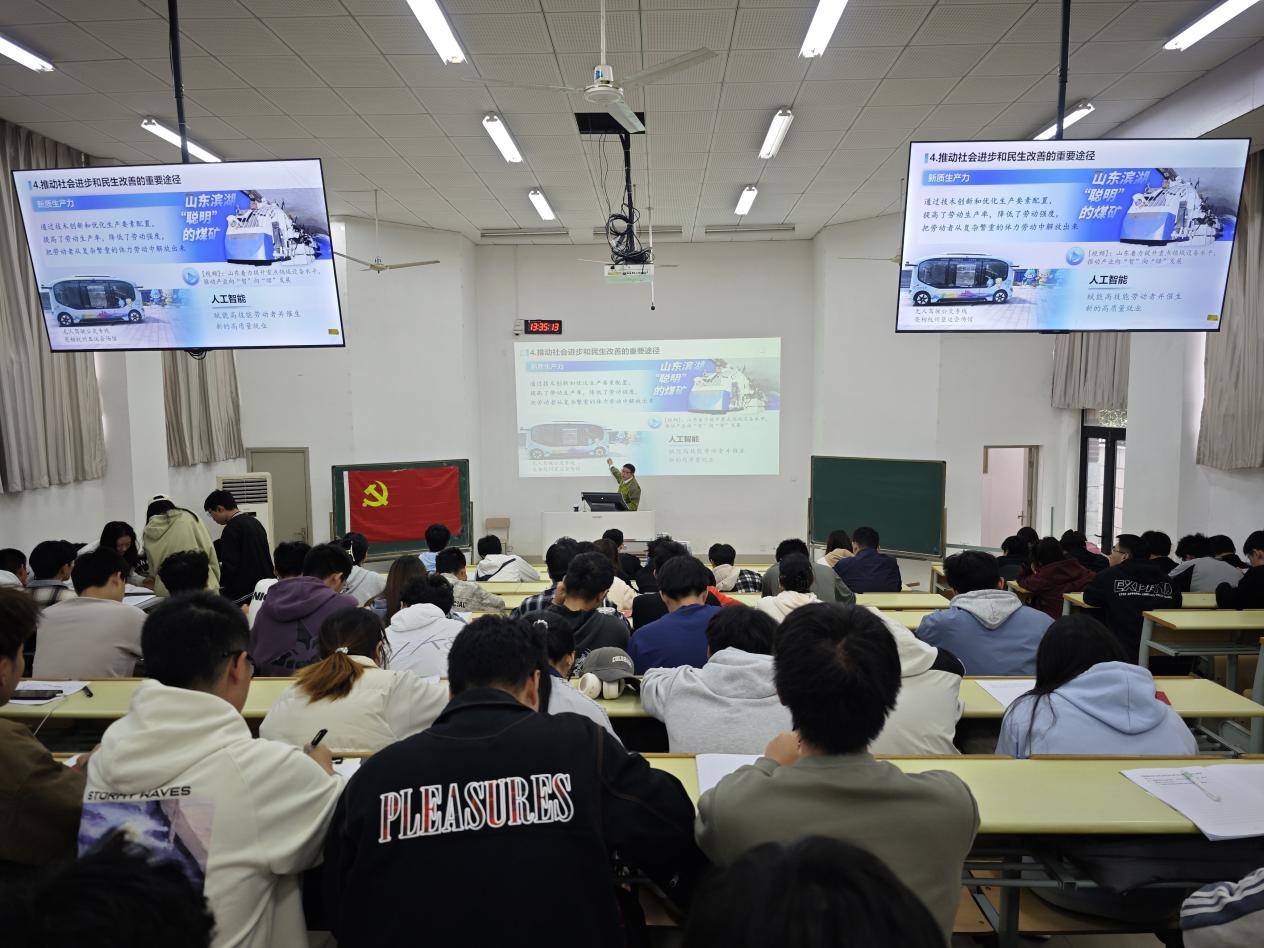 他结合山东滨湖的“聪明的煤矿”、杭州的无人驾驶公交等典型案例,潜移默化地讲解通过技术创新和优化生产要素配置,新质生产力在推动经济快速发展中的现实应用。