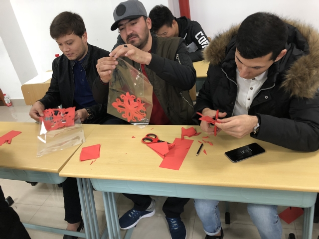 本次活动邀请书法达人朱昱嘉为职工讲授书法的起源等,他写的“明德至善”引起了大家的兴趣,职工们纷纷聚拢观看,跃跃欲试,职工们在欣赏书法作品的同时也能学习书写。在留学服务部的成员们的指导下,职工们拿起剪刀和红纸,体验着传统剪纸艺术的乐趣,感受着劳动人民勤劳善思的智慧与情趣。